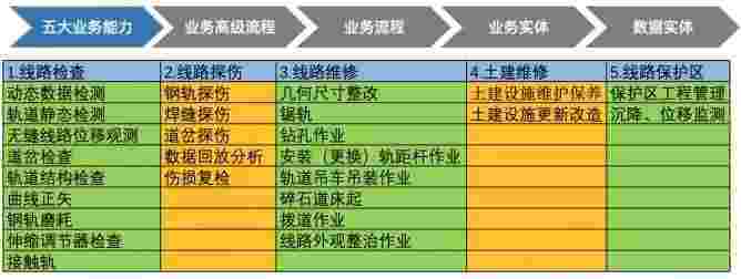 在轨道运维业务中,,,,,,,,我们形成了完整的从业务能力(业务域)-业务流程-业务实体-数据模型的分析梳理过程。。。。。。。。轨道运维业务能力如下图所示:::::::::::::::