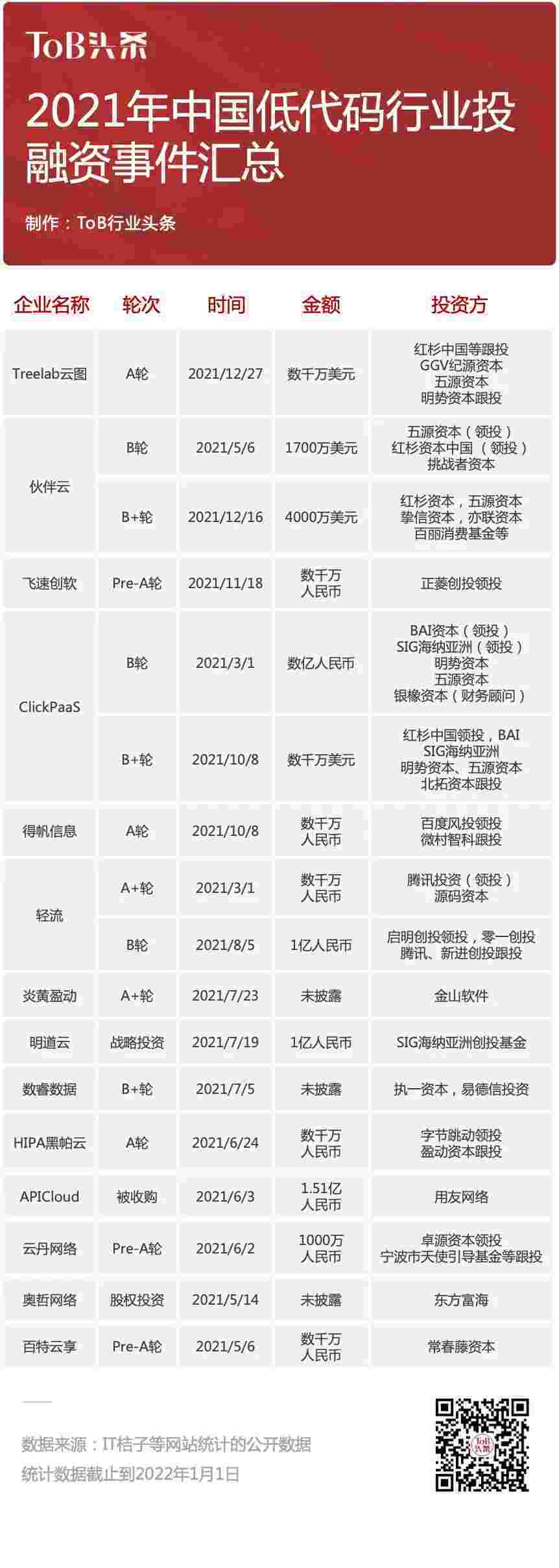 到2021年,,,,,,,,,无/低代码投融资规模势头更甚,,,,,,,,,,其中包括轻流两轮融资(A+轮数千万人民币,,,,,,,,,,B轮近亿人民币)、、、、、、、、、、、小微钱包 两轮融资(B轮数亿人民币,,,,,,,,,B+轮数千万美元)、、、、、、、、、、百特云享数千万元Pre-A轮融资......
